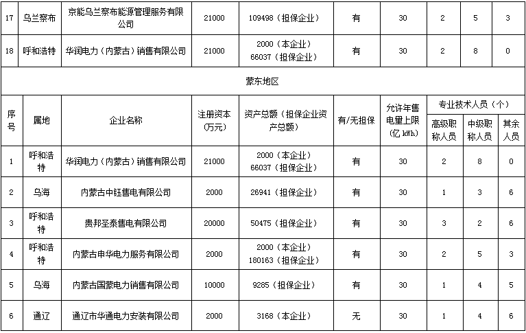 內(nèi)蒙古第三批30家售電公司參與電力市場公示名單