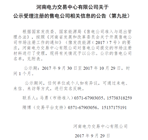 河南電力交易中心關(guān)于公示受理注冊(cè)的售電公司相關(guān)信息的公告(第九批)