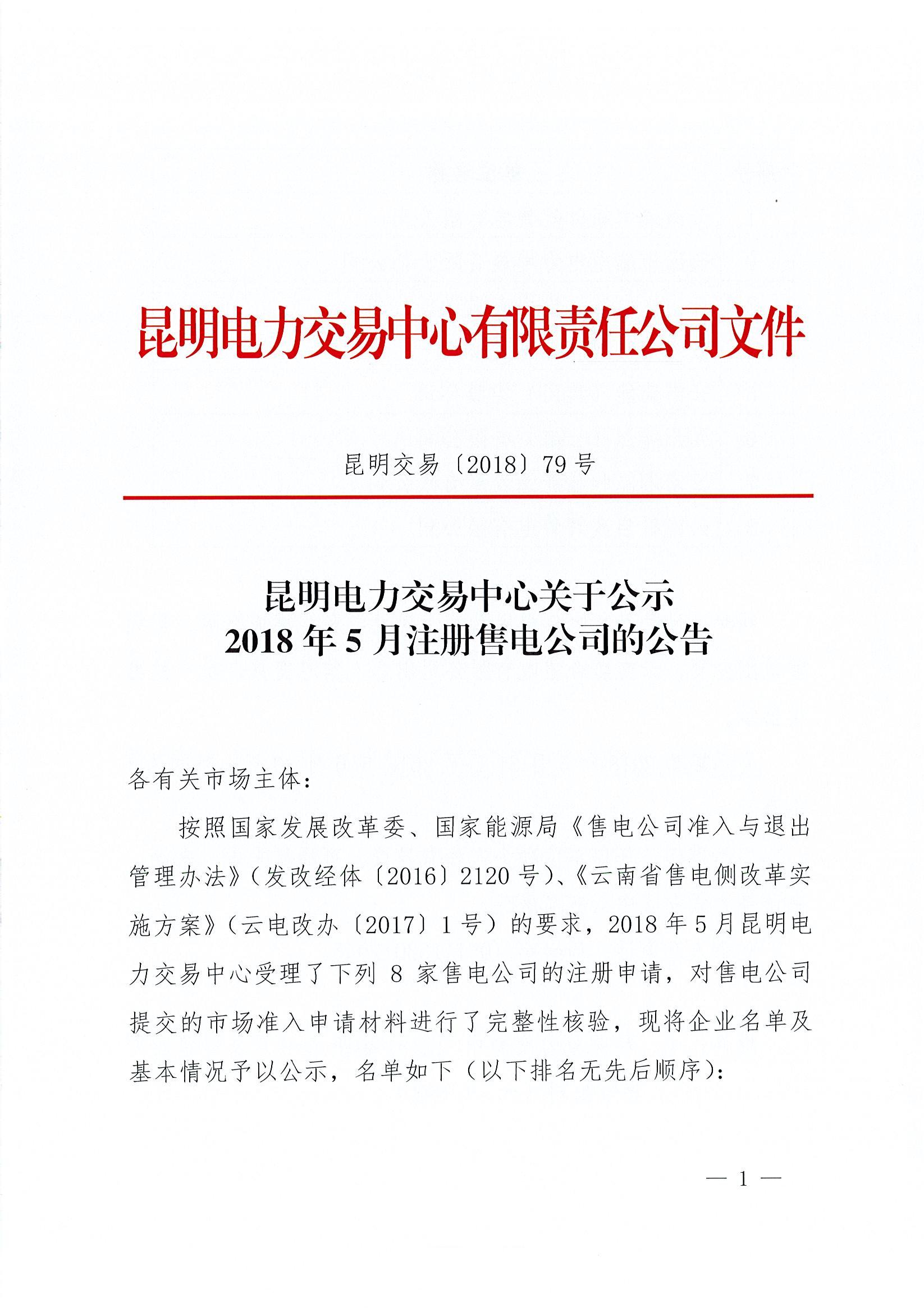 昆明電力交易中心日前發(fā)布了《關(guān)于公示2018年5月注冊(cè)售電公司的公告》,昆明電力交易中心受理了8家售電公司的注冊(cè)申請(qǐng),公示期為2018年5月31日至2018年6月30日。詳情如下: