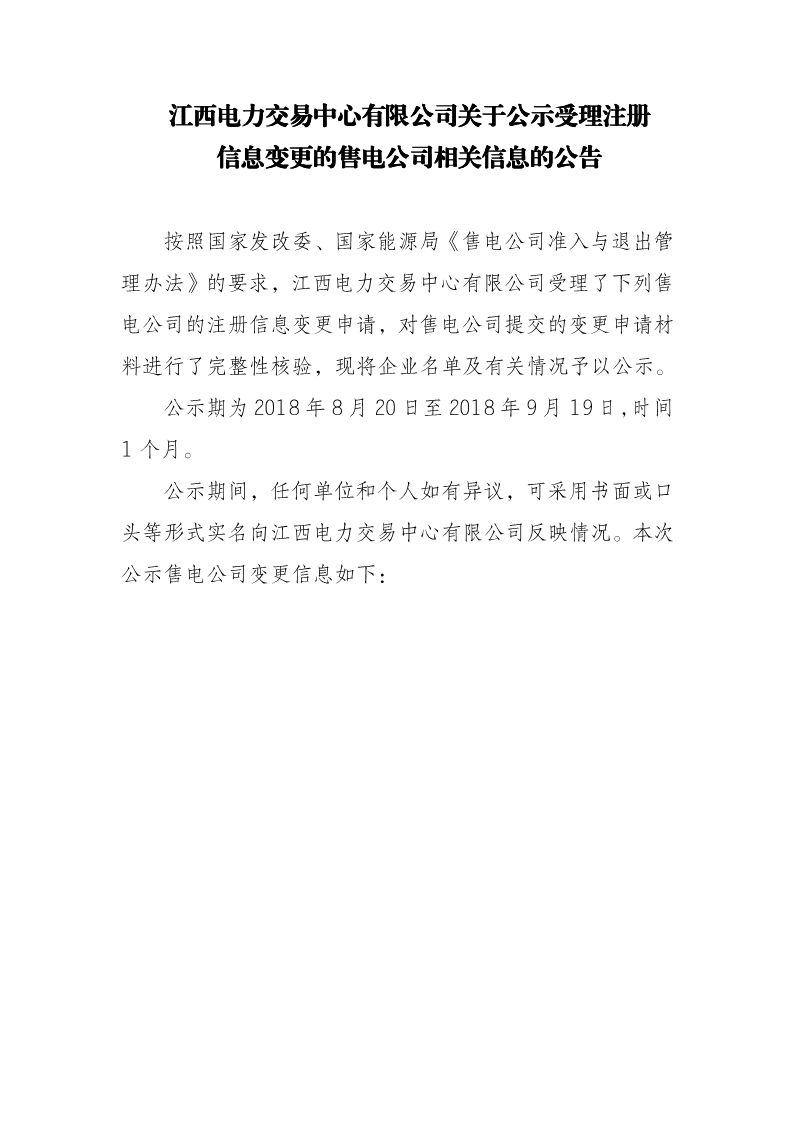 江西電力交易中心日前發(fā)布了《江西電力交易中心有限公司關(guān)于受理注冊信息變更的售電公司相關(guān)信息的公告的申請》,按照國家發(fā)改委、國家能源局《售電公司準(zhǔn)入與退出管理辦法》的要求,江西電力交易中心有限公司受理了國網(wǎng)江西綜合能源服務(wù)有限公司等3家售電公司的注冊信息變更申請,對售電公司提交的變更申請材料進行了完整性核驗,現(xiàn)將企業(yè)名單及有關(guān)情況予以公示。公示期為2018年8月20日至2018年9月19日,時間1個月。詳情如下: