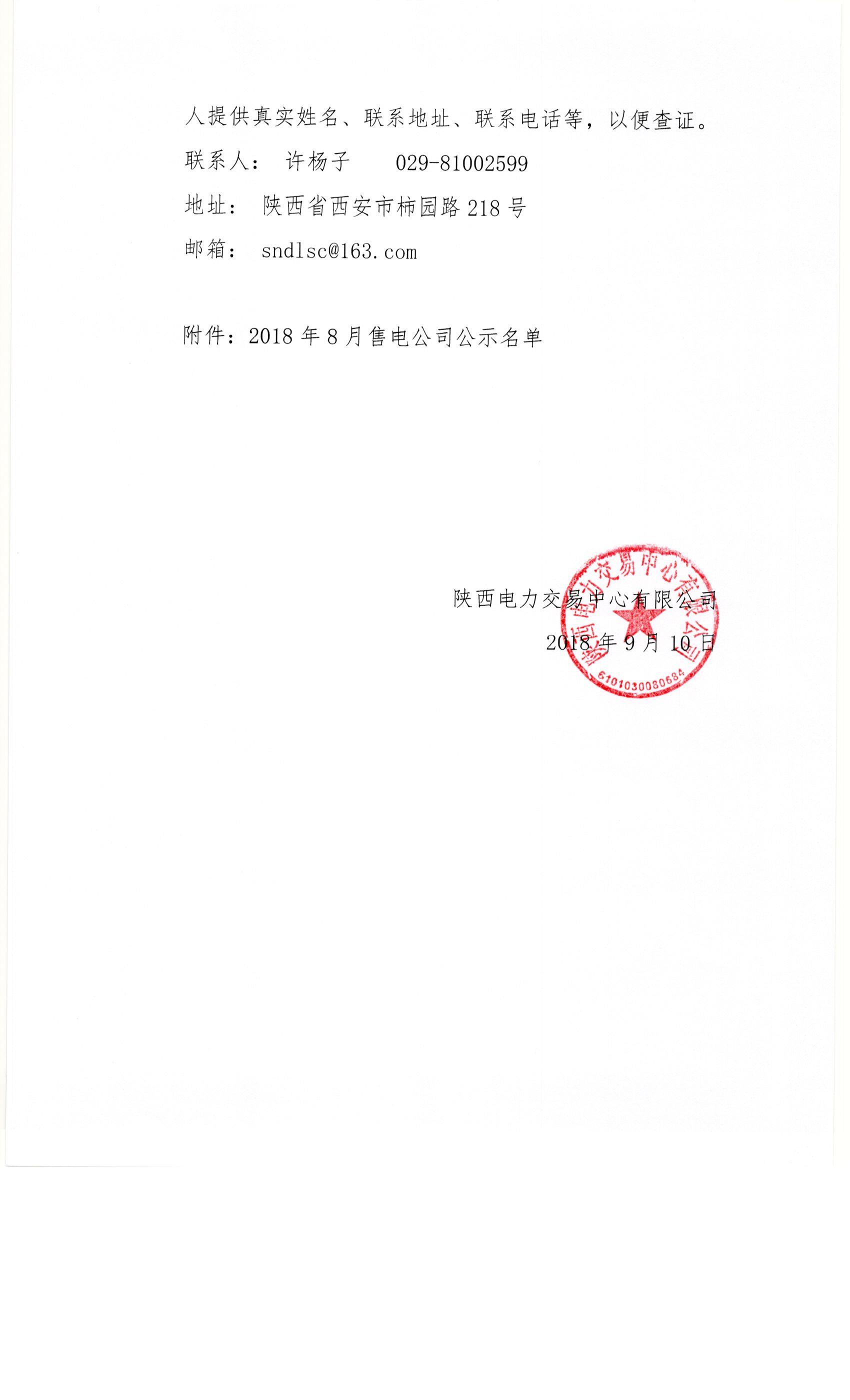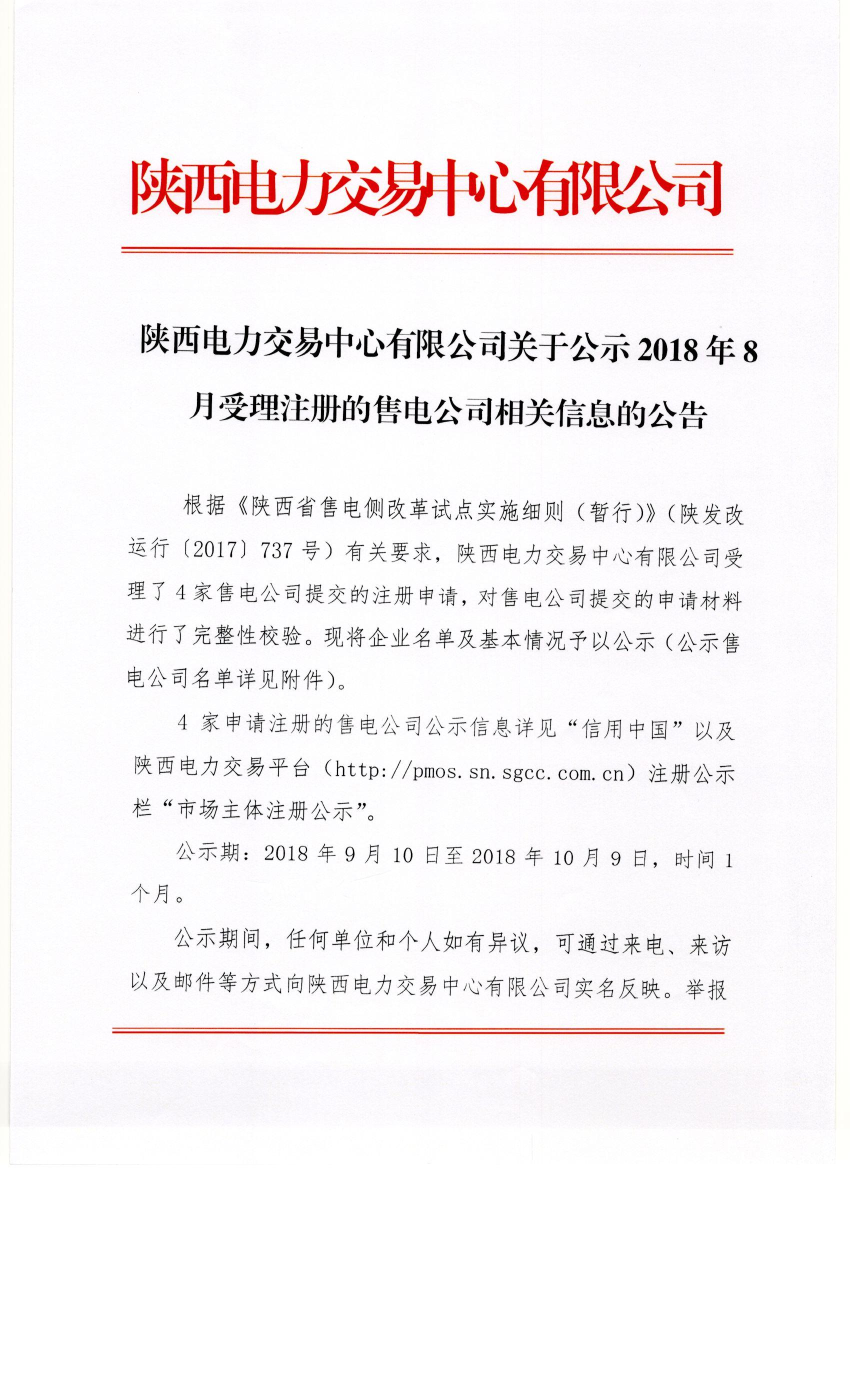 陜西電力交易中心日前發(fā)布了《陜西電力交易中心有限公司關(guān)于公示2018年8月受理注冊的售電公司相關(guān)信息的公告》,陜西電力交易中心有限公司受理了陜西新奧新能能源發(fā)展有限公司等4家售電公司提交的注冊申請,對售電公司提交的申請材料進(jìn)行了完整性校驗(yàn)?,F(xiàn)將企業(yè)名單及基本情況予以公示。公示期:2018年9月10日至2018年10月9日,時(shí)間1個(gè)月。詳情如下: