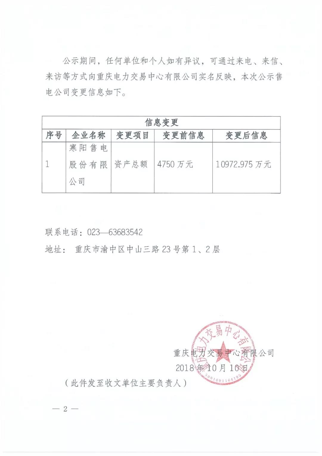 按照國家發(fā)改委、國家能源局《售電公司準入與退出管理辦法》(發(fā)改經(jīng)體〔2016〕2120號)要求,“業(yè)務(wù)范圍、公司股東、股權(quán)結(jié)構(gòu)等有重大變化的,售電公司應(yīng)再次予以承諾、公示”。重慶電力交易中心有限公司受理了寒陽售電股份有限公司的重大信息變更申請,并對提交的申請材料進行了