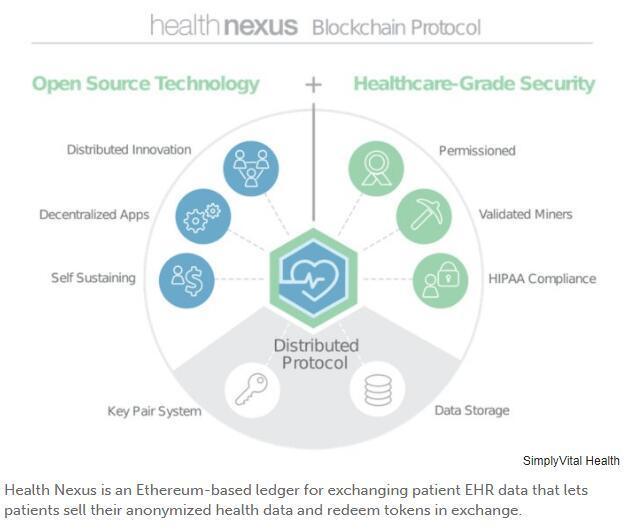 SimplyVital的ConnectingCare是一個(gè)區(qū)塊鏈網(wǎng)絡(luò),用于跟蹤住院后患者護(hù)理,為保險(xiǎn)公司和聯(lián)邦醫(yī)療保險(xiǎn)/醫(yī)療補(bǔ)助報(bào)銷創(chuàng)建不變的審計(jì)跟蹤。該公司的Health Nexus是一個(gè)基于以太坊的區(qū)塊鏈分類賬,用于在提供者之間交換患者EHR數(shù)據(jù),同時(shí)還允許患者將他們的匿名健康數(shù)據(jù)出售給他們想要的任何人——并將代幣兌換為獎(jiǎng)勵(lì)。