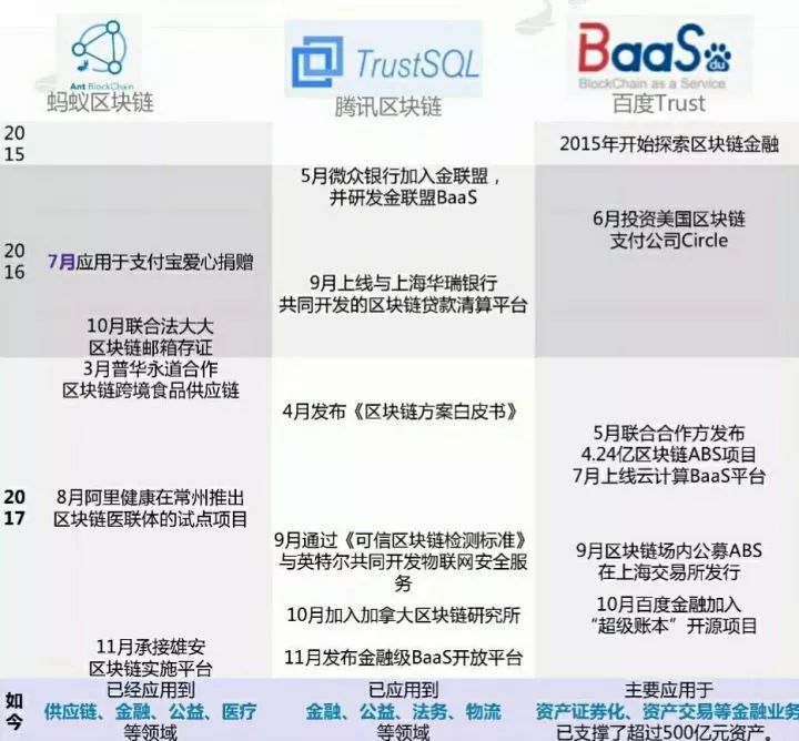 既然要談區(qū)塊鏈的國內(nèi)應(yīng)用開發(fā),自然得先從BAT三巨頭談起