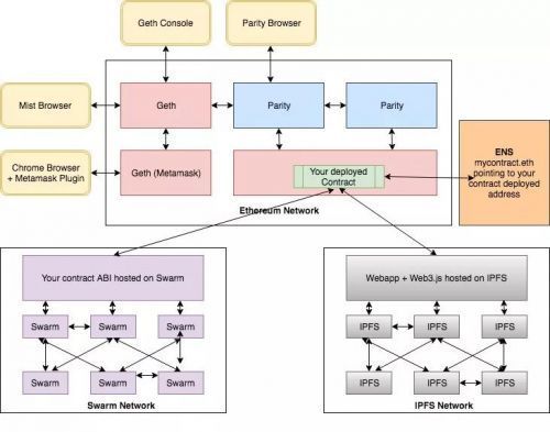 區(qū)塊鏈在存儲(chǔ)少量數(shù)據(jù)的時(shí)候是OK的。但如果想存儲(chǔ)一些比如患者病歷,銷售合同或某些需要公開時(shí)間戳的大文件時(shí)該怎么辦呢?在區(qū)塊鏈中存儲(chǔ)這種大文件數(shù)據(jù)的內(nèi)存需求是昂貴的,并且也不能在所存儲(chǔ)的塊上擴(kuò)展。Swarm( http://swarm-gateways.net/bzz:/theswarm.eth/ )就是用來解決這個(gè)問題的。它是一個(gè)去中心化的內(nèi)容存儲(chǔ)和分發(fā)服務(wù)。你可以將其視為CDN,但它并不是在一家公司的服務(wù)器上托管整個(gè)CDN,而是通過互聯(lián)網(wǎng)分布在很多計(jì)算機(jī)上。 就像連接到以太坊網(wǎng)絡(luò)需要運(yùn)行一個(gè)以太坊節(jié)點(diǎn)一樣,你需要運(yùn)行一個(gè)Swarm節(jié)點(diǎn)來連接到Swarm網(wǎng)絡(luò)。