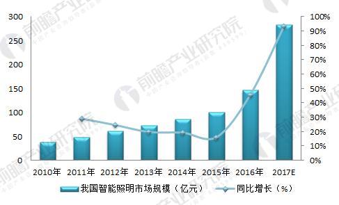 20世紀(jì)90年代開(kāi)始,國(guó)外智能照明系統(tǒng)廠商開(kāi)始在中國(guó)投資建廠。近幾年,中國(guó)智能照明市場(chǎng)增長(zhǎng)迅速,市場(chǎng)規(guī)模從2005年的19億元增長(zhǎng)至2016年的147億元,年增長(zhǎng)率保持在25%左右。2016年,我國(guó)智能照明行業(yè)市場(chǎng)規(guī)模約為124億元,較上年同比增長(zhǎng)93.20%。為智能照明應(yīng)用爆發(fā)增長(zhǎng)的一年,未來(lái),在智能家居、智能辦公等智慧化的推動(dòng)下,2017年我國(guó)智能照明行業(yè)的市場(chǎng)規(guī)模有望超過(guò)200億元,實(shí)現(xiàn)大規(guī)模增長(zhǎng)。