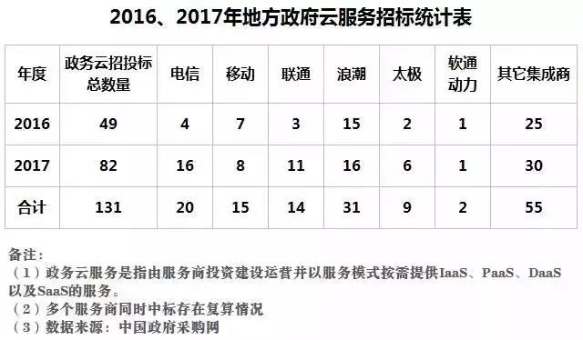 2017年5月工業(yè)和信息化部(下稱工信部)印發(fā)的《云計(jì)算發(fā)展三年行動(dòng)計(jì)劃》(下稱《行動(dòng)計(jì)劃》)提出,“到2019年,我國云計(jì)算產(chǎn)業(yè)規(guī)模達(dá)到4300億元”。借助云計(jì)算這個(gè)經(jīng)濟(jì)發(fā)展新動(dòng)能的助燃劑,為大數(shù)據(jù)、物聯(lián)網(wǎng)、人工智能等新興領(lǐng)域和傳統(tǒng)行業(yè)的轉(zhuǎn)型發(fā)展提供基礎(chǔ)支撐?!缎袆?dòng)計(jì)劃》亦明確提出“爭(zhēng)取2019年前國內(nèi)涌現(xiàn)出2至3家世界級(jí)有競(jìng)爭(zhēng)力的云計(jì)算企業(yè)”,云服務(wù)商將迎來大發(fā)展的重要窗口期。事實(shí)上,不僅以BAT為首的中國互聯(lián)網(wǎng)企業(yè)在向著這個(gè)目標(biāo)前進(jìn),我國三大電信運(yùn)營(yíng)商、網(wǎng)易、浪潮、中科曙光、華為、萬達(dá)、京東等一眾巨頭也早就入局。《計(jì)劃》中特別明確“以工業(yè)云、政務(wù)云等重點(diǎn)行業(yè)領(lǐng)域應(yīng)用為切入點(diǎn)”,既反映出我國政務(wù)領(lǐng)域信息化程度較低,已不能滿足當(dāng)前社會(huì)治理和生產(chǎn)的需求的現(xiàn)實(shí),更談不上智慧。也再次砸實(shí)了政務(wù)云的市場(chǎng)潛力。2016-2017年已成為國內(nèi)有實(shí)力的云計(jì)算供應(yīng)商搶灘各地政府云基礎(chǔ)設(shè)施采購的開端之年。見下表: