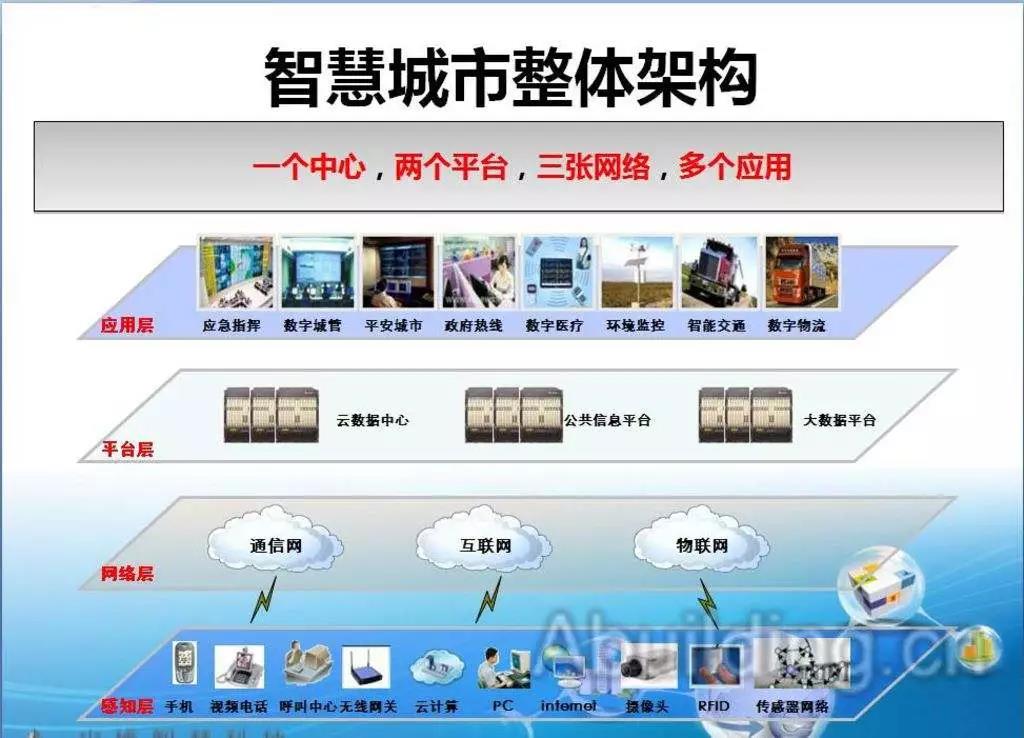 智慧城市整體架構(gòu)概括一句話“一個(gè)中心,兩個(gè)平臺(tái)、三張網(wǎng)絡(luò),多個(gè)應(yīng)用”。下面就智慧城市整體架構(gòu)進(jìn)行分析一下運(yùn)營(yíng)商能參與哪些項(xiàng)目: