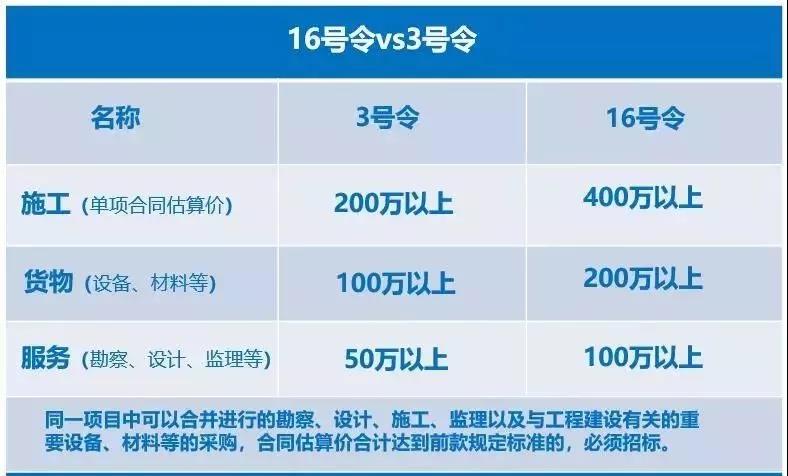 與原3號(hào)令相比提高了一倍。同時(shí),取消了“單項(xiàng)合同估算價(jià)低于上述規(guī)定的標(biāo)準(zhǔn),但項(xiàng)目總投資在3000萬元人民幣以上”的規(guī)定。