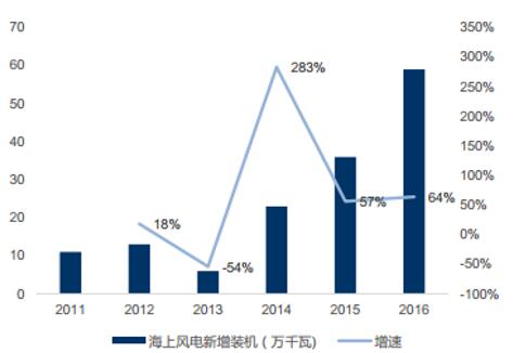 值得注意的是,與陸上風(fēng)電裝機(jī)下行相反,2016 年中國(guó)的海上風(fēng)電裝機(jī)則增長(zhǎng)了六成。2016 中國(guó)海上風(fēng)電新增裝機(jī) 154 臺(tái),容量達(dá)到 59 萬千瓦,同比增長(zhǎng) 64%。