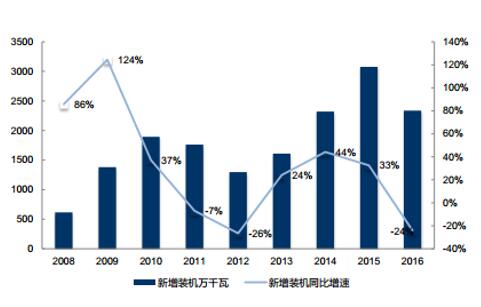 綜合國(guó)內(nèi)外的數(shù)據(jù)來看, 截至 2016 年,我國(guó)風(fēng)電新增裝機(jī)達(dá)約占全球風(fēng)電市場(chǎng)份額的42.7%,以絕對(duì)優(yōu)勢(shì)領(lǐng)跑全球風(fēng)電市場(chǎng)。而 2016 年國(guó)內(nèi)市場(chǎng)經(jīng)歷了風(fēng)電搶裝后的回調(diào), 同時(shí)疊加電力需求下降和電網(wǎng)消納風(fēng)電能力不足, 導(dǎo)致國(guó)內(nèi)市場(chǎng)的裝機(jī)容量明顯下滑,進(jìn)而全球市場(chǎng)風(fēng)電新增裝機(jī)容量隨之下滑。