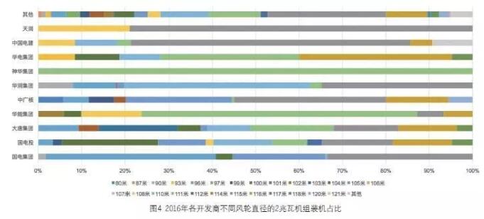 就整機(jī)商而言,在2016 年2 兆瓦機(jī)組新增裝機(jī)排名前五的企業(yè)中,金風(fēng)科技雖然是裝機(jī)規(guī)模最大的企業(yè),但風(fēng)輪直徑的規(guī)格卻是最少的,只有108 米和115 米兩種,后者的占比更是高達(dá)89.9%。其他4 家企業(yè)的風(fēng)輪直徑規(guī)格都不少于3 種,湘電風(fēng)能的最多,達(dá)到6 種。中國(guó)海裝裝機(jī)比例最高的是110 米機(jī)型,占到全部新增裝機(jī)的84.5%。在明陽(yáng)智能的2 兆瓦新增裝機(jī)中,104 米和110 米機(jī)型占據(jù)了絕大部分的份額。對(duì)于聯(lián)合動(dòng)力和湘電風(fēng)能而言,前者的2 兆瓦主力機(jī)型是96 米和115 米兩種規(guī)格,而后者裝機(jī)較多的則是96 米、105 米和116 米機(jī)型。