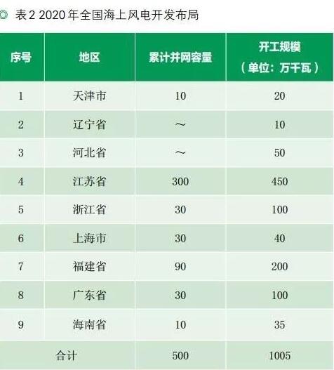 根據(jù)《風(fēng)電發(fā)展“十三五”規(guī)劃》,“十三五”期間將積極穩(wěn)妥推進(jìn)海上風(fēng)電建設(shè),重點推動江蘇、浙江、福建、廣東等省的海上風(fēng)電建設(shè),到2020年四省海上風(fēng)電開工建設(shè)規(guī)模均達(dá)到百萬千瓦以上;積極推動天津、河北、上海、海南等省(市)的海上風(fēng)電建設(shè);探索性推進(jìn)遼寧、山東、廣西等省(區(qū))的海上風(fēng)電項目。到2020年,全國海上風(fēng)電開工建設(shè)規(guī)模達(dá)到1000萬千瓦,力爭累計并網(wǎng)容量達(dá)到500萬千瓦以上。詳細(xì)情況見表2。