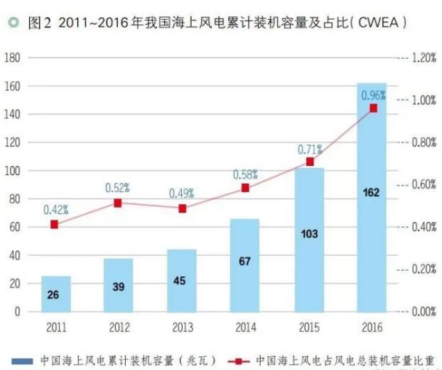 根據(jù)中國可再生能源學(xué)會風(fēng)能專業(yè)委員會(CWEA)數(shù)據(jù),截至2016年底,我國已建成海上風(fēng)電累計裝機(jī)容量162萬千瓦。2009年,東海大橋海上示范風(fēng)電場率先建成投產(chǎn),之后的3年里,江蘇如東30兆瓦和150兆瓦潮間帶試驗、示范風(fēng)電場及其擴(kuò)建工程將陸續(xù)開工建成。2012年底我國海上風(fēng)電場累計裝機(jī)接近40萬千瓦;受海域使用推進(jìn)緩慢等因素影響,2013 年海上風(fēng)電發(fā)展明顯放緩;2014年,我國海上風(fēng)電新增并網(wǎng)容量約20萬千瓦,全部位于江蘇省;2015年我國海上風(fēng)電新增裝機(jī)容量為36萬千瓦,主要分布在江蘇省和福建省。2016 年中國海上風(fēng)電新增裝機(jī)154臺,容量達(dá)到59萬千瓦,同比增長64%。我國海上風(fēng)電占全國風(fēng)電總裝機(jī)容量的比重由2011年的0.42%上升至2016年的0.96%。2011~2016年我國海上風(fēng)電累計裝機(jī)容量及占比如圖2所示。