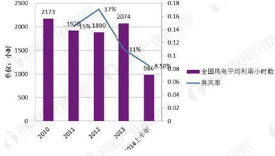 中國(guó)風(fēng)電年平均利用小時(shí)數(shù)和棄風(fēng)率