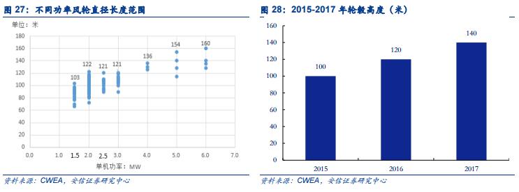 與此同時(shí),風(fēng)輪直徑也出現(xiàn)加大的趨勢,輪轂高度也在不斷增加。1.5MW 的風(fēng)輪直徑從 66m 增長到 121m,2.0MW 的風(fēng)輪直徑從 72m 增長到 122 米。在全國吊裝的風(fēng)電機(jī)組中,輪轂中心高度范圍在 65m~120m,2016 年最大值 120m 比 2015 年增長 20m,2017 年已經(jīng)出現(xiàn) 140m。雖然分散式風(fēng)電單位開發(fā)成本更高,但技術(shù)的進(jìn)步帶來發(fā)電效率的提升使得位于低風(fēng)速區(qū)的分散式項(xiàng)目目前也具備較好的經(jīng)濟(jì)性。