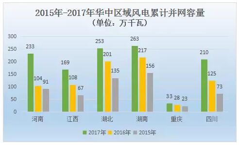 作為分散式風(fēng)電較為集中的華中區(qū)域,2015年至2017年風(fēng)電累計(jì)并網(wǎng)容量持續(xù)增長(zhǎng)。河南、江西、湖北、湖南、重慶、四川2017年風(fēng)電累計(jì)并網(wǎng)容量分別為233萬千瓦、169萬千瓦、253萬千瓦、33萬千瓦、210萬千瓦,同比2016年增長(zhǎng)124.0%、56.5%、25.9%、30.9%、17.9%、68.0%。