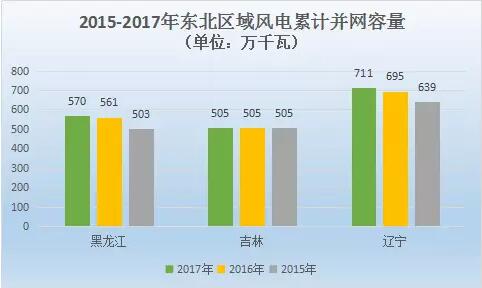 東北區(qū)域是適宜建設(shè)風(fēng)電場(chǎng)的區(qū)域,大規(guī)模建設(shè)后,也讓近幾年棄風(fēng)率較高,這也就造成了三年來東北區(qū)域新增裝機(jī)容量有限,吉林甚至出現(xiàn)了三年零增長(zhǎng)的情況。從下圖中可以看出,黑龍江、吉林、遼寧2017年風(fēng)電累計(jì)并網(wǎng)容量為570萬千瓦、505萬千瓦、711萬千瓦。