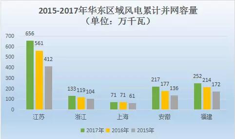 華東區(qū)域沿海風(fēng)電資源豐富,以江蘇、福建兩省份最為突出,2017年江蘇和福建風(fēng)電并網(wǎng)容量分別為656萬千瓦、252萬千瓦,同比增長(zhǎng)16.9%、17.8%。
