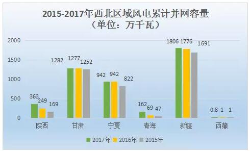 西北區(qū)域也是我國(guó)大規(guī)模風(fēng)電較為集中的區(qū)域。2017年,陜西、甘肅、寧夏、青海、新疆、西藏累計(jì)裝機(jī)容量分別為363萬千瓦、1282萬千瓦、942萬千瓦、162萬千瓦、1806萬千瓦、0.8萬千瓦,其中陜西、甘肅、青海、新疆同比增長(zhǎng)45.8%、0.4%、134.8%、1.7%。