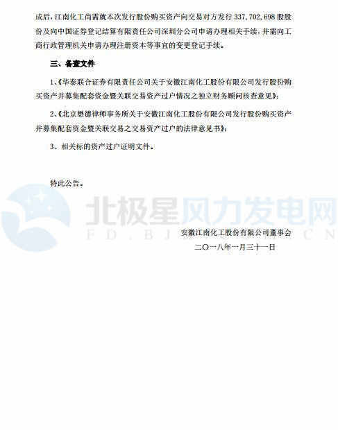 江南化工近日稱,盾安新能源已于2018年1月26日經(jīng)浙江省工商行政管理局核準將公司名稱變更為浙江盾安新能源發(fā)展有限公司,企業(yè)類型由股份有限公司變更為一人有限責(zé)任公司(私營法人獨資),并已取得新的《營業(yè)執(zhí)照》(統(tǒng)一社會信用代碼:913301085714904027),標的資產(chǎn)過戶手續(xù)已經(jīng)全部辦理完成,江南化工已持有盾安新能源100%股權(quán)。