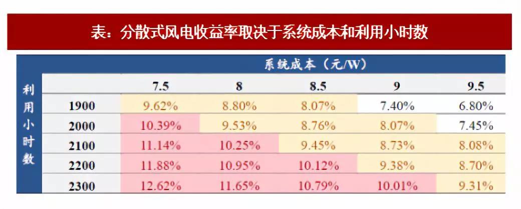 ▼表:分散式風(fēng)電收益率取決于系統(tǒng)成本和利用小時數(shù)
