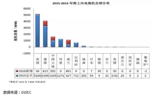 據(jù)全球風(fēng)能理事會(GWEC)統(tǒng)計,2016年全球海上風(fēng)電新增裝機2,219MW,主要發(fā)生在七個市場。盡管裝機量比去年同期下降了31%,但未來前景看好,全球14個市場的海上風(fēng)電裝機容量累計為14,384MW。英國是世界上最大的海上風(fēng)電市場,裝機容量占全球的近36%,其次是德國占29%。2016年,中國海上風(fēng)電裝機量占全球裝機量的11%,取代了丹麥,躍居第三。其次,丹麥占8.8%,荷蘭7.8%,比利時5%,瑞典1.4%。除此之外還包括芬蘭、愛爾蘭、西班牙、日本、韓國、美國和挪威等市場,共同促進了整個海上風(fēng)電的發(fā)展。