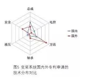 圖5 顯示了變槳系統(tǒng)國內(nèi)外專利申請的技術(shù)分布對比雷達(dá)圖,其中申請量按照百分計算。從圖中可以看出,在變槳系統(tǒng)的七大技術(shù)分支中,國內(nèi)外最關(guān)注的技術(shù)點不同。首先,國內(nèi)申請人較為關(guān)注變槳裝置總成,占總申請量的26% ;而國外申請人對變槳控制方法的關(guān)注遠(yuǎn)遠(yuǎn)超出了其他技術(shù)分支,占到總申請量的43%。進(jìn)一步對這些申請進(jìn)行詳細(xì)分析后可以看出,上述國內(nèi)申請主要涉及變槳裝置總體結(jié)構(gòu)的改進(jìn),而國外申請更加關(guān)注獨立變槳控制方法、根據(jù)信號執(zhí)行變槳控制的方法等。其次,國外申請非常關(guān)注變槳系統(tǒng)在安全和可靠性方面的改進(jìn),涉及該方面的申請量所占比重很大,達(dá)到21% ;而國內(nèi)對這方面的關(guān)注較少,僅占總申請量的6%。另一方面,國內(nèi)申請人較為關(guān)注的電控、液壓變槳系統(tǒng)則少有國外申請。