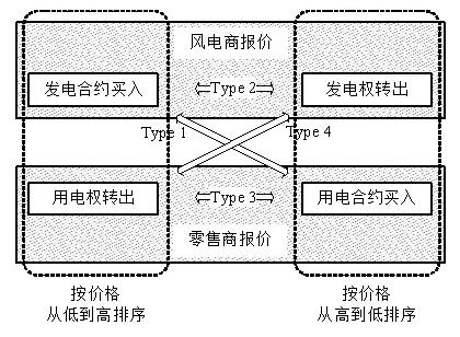 本文首先提出了一種與現(xiàn)有市場(chǎng)環(huán)境兼容的時(shí)前交易模式,即在每一小時(shí)前通過(guò)市場(chǎng)交易確定這一個(gè)小時(shí)的電能價(jià)格和供熱電量。交易采用循環(huán)競(jìng)價(jià)的模式,成交關(guān)系如圖1所示。在極端的情況下通過(guò)引入火電商來(lái)保證供熱的進(jìn)行。
