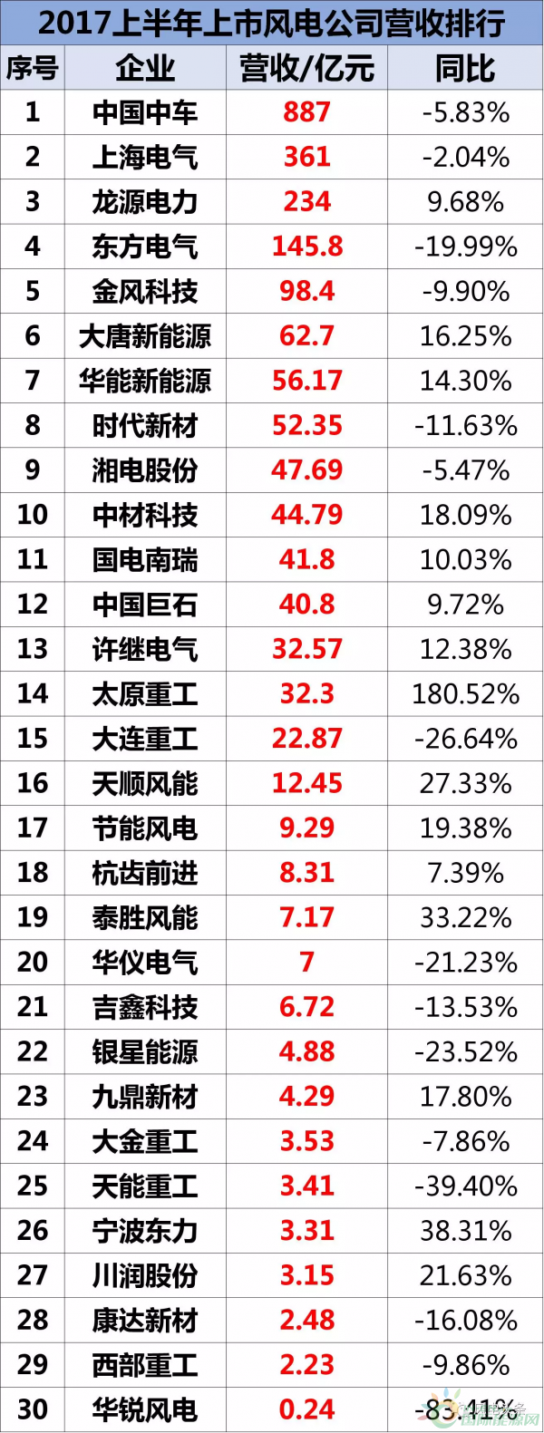 2017上半年,30家風(fēng)電上市公司實(shí)現(xiàn)營收達(dá)2238.7億元!14家企業(yè)營收為負(fù)增長,華銳風(fēng)電營收最低;而太原重工實(shí)現(xiàn)了180.52%的營收增長。具體如下表: