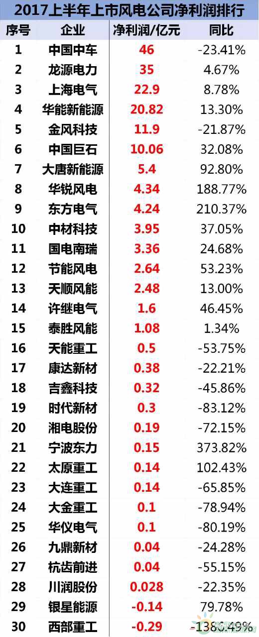 上半年,這30家企業(yè)實(shí)現(xiàn)凈利潤177.76億元!有10家企業(yè)增長為負(fù),已經(jīng)停牌的西部重工凈利潤也為負(fù)值。金風(fēng)科技實(shí)現(xiàn)了11.9億元的利潤,但增長為負(fù),對比去年同期業(yè)績還是有所下滑。具體情況如下表所示: