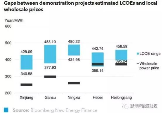 •   彭博新能源財經(jīng)按照過去五年每省平均棄風(fēng)率計算得出,冀北地區(qū)的示范項目可實現(xiàn)平價上網(wǎng),其余省份項目的平準(zhǔn)化電力成本(LCOE)均高于標(biāo)桿電價,但不排除優(yōu)質(zhì)項目大幅超過省平均利用小時數(shù),達到平價上網(wǎng)水平。