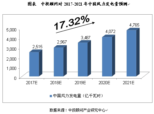 中投顧問(wèn)對(duì)2017-2021年中國(guó)風(fēng)力發(fā)電量預(yù)測(cè)