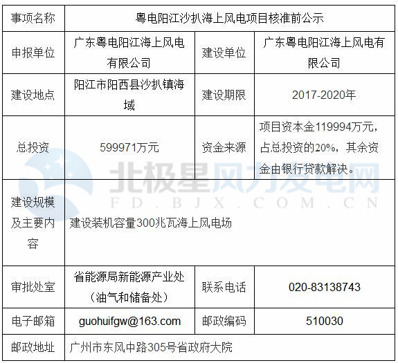 廣東發(fā)改委近日發(fā)布粵電陽江沙扒海上風電項目核準前公示,公示期為2017.9.19至2017.9.25。該項目建設單位為廣東粵電陽江海上風電有限公司,建設地點位于陽江市陽西縣沙扒鎮(zhèn)海域,建設期限2017-2020年,總裝機300兆瓦,總投資599971萬元。以下為公示原文: