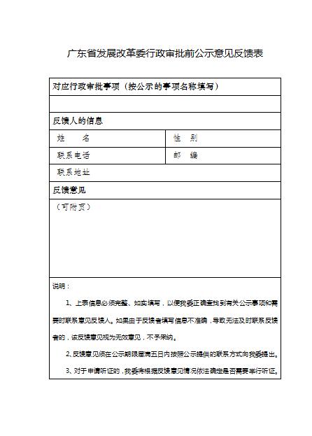 本公示的期限為2017.9.19至2017.9.25。公民、法人和其他經(jīng)濟組織在公示期限屆滿后五個工作日內,對本行政審批事項直接涉及自身重大利益或者自身與申請人重大利益的,可依法向我委書面陳述、申辯、申請聽證;對本行政審批事項內容有其他意見建議的,也可向我委提出。(以上應填寫《廣東省發(fā)展改革委行政審批前公示意見反饋表》并按上表提供的聯(lián)系方式提交)。