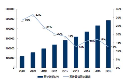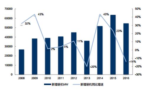 2016 年行整體增速放緩。 風電行業(yè)一直保持著世界增長最快的能源地位。在 2001 年至 2015 年間,全球風電累計裝機容量的年復合增長率為 22.99%, 累計總裝機容量從 23,900MW 增至 432,883MW。 而2016 年全球風電市場新增裝機容量 54.6GW,同比下滑 14%。 截止 2016 年底,全球累計裝機容量達到 486.7GW。