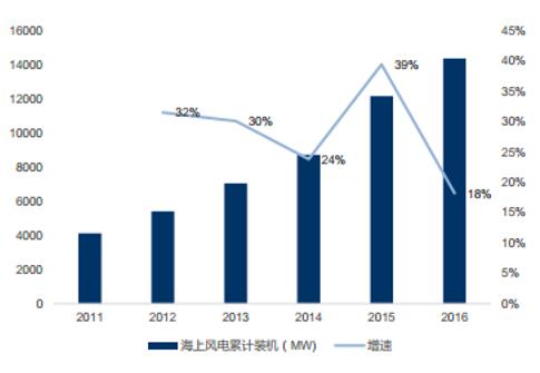 相比之下, 海上風電增長增速高于陸上風電,成為未來風電行業(yè)重要的增量。 事實上,伴隨著陸上風電可開發(fā)的區(qū)域逐漸減少,而海上風電資源豐富,且沿海地區(qū)經(jīng)濟發(fā)達,電網(wǎng)容量更大,風電接入條件更好,近年來風電行業(yè)逐漸由陸上向近海發(fā)展。 2001 年-2015年全球海上風電累計裝機容量復合增長率 43.51%,2015年累計裝機容量 12167MW。2016 年全球海上風電市場新增裝機容量 2217MW,同比下滑 36%。 截止 2016 年底,全球海上風電累計裝機容量達到 14384MW。
