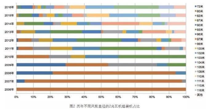 圖1 和圖2 分別為2006 年—2016 年,我國不同風輪直徑的2 兆瓦機組新增裝機以及占比情況。從中可以看出,歷年有新增裝機的2 兆瓦機組的風輪直徑類型日趨豐富,2016 年達到24 種之多。