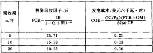 上一段文字我們分析了風(fēng)能發(fā)電的優(yōu)缺點(diǎn),那么接下來以水平軸中風(fēng)力發(fā)電機(jī)來進(jìn)行風(fēng)能發(fā)電成本計(jì)算。水平軸中型風(fēng)力發(fā)電機(jī)組額定容量PR=200千瓦,設(shè)備及工程總投資費(fèi)用IC = 30萬美元,年運(yùn)行及維修費(fèi)用率OM=2%。要求的年回收率IR=9%(其中包括1%的保險(xiǎn)費(fèi)用)。風(fēng)力發(fā)電機(jī)安裝在年平均風(fēng)速為6米/秒的地區(qū)內(nèi),容量系數(shù)CF=23%。則投資回收期分別為5年、10年及20年的發(fā)電成本計(jì)算如下: