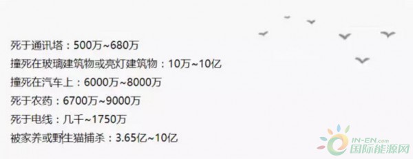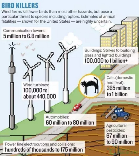 據(jù)美國漁業(yè)與野生動物協(xié)會統(tǒng)計(jì),在美國平均每年有10萬到44萬只鳥類因撞到風(fēng)機(jī)而死亡,看起來是個不小的數(shù)字,但是如果和其他的死亡數(shù)字來比較:
