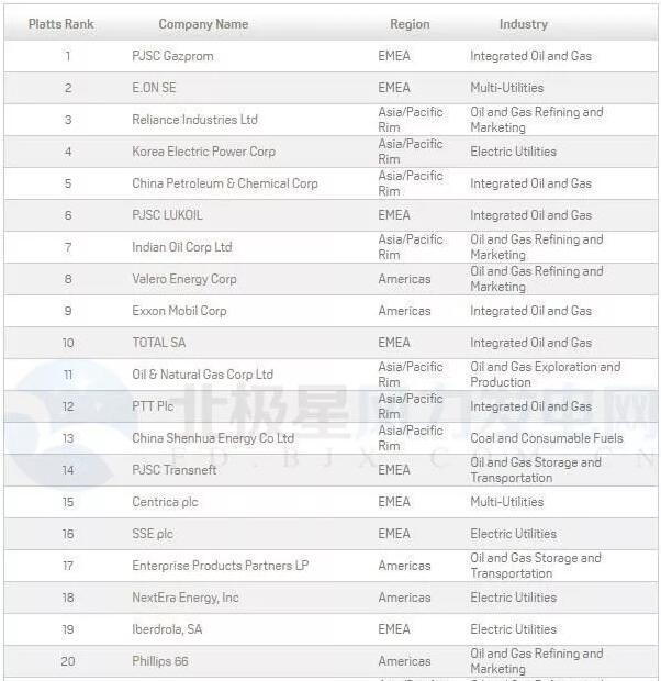 國(guó)際著名市場(chǎng)情報(bào)機(jī)構(gòu)普氏能源近日發(fā)布了2017年度普氏全球能源公司Top 250榜單。普氏能源于2002年首次發(fā)布年度能源公司Top250榜單,該榜單旨在肯定鼓勵(lì)本年度為全球能源做出杰出貢獻(xiàn)的能源企業(yè)。普氏全球能源公