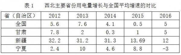 從2013年開始,西北主要省份的社會(huì)用電量增長(zhǎng)出現(xiàn)明顯下降和波動(dòng)(見表1),新疆社會(huì)用電量波動(dòng)最大,從2013、2014年的31%下降到2016年的12%,降幅近20個(gè)百分點(diǎn)。寧夏、青海到2016年變成了負(fù)增長(zhǎng)。只有甘肅從2013年的2.0%上升到2016年的5.0%,電力需求增速與全國(guó)平均持平。而東部、中部用電量同比分別增長(zhǎng)5.9%、5.4%,是全國(guó)用電增長(zhǎng)的主要拉動(dòng)力。