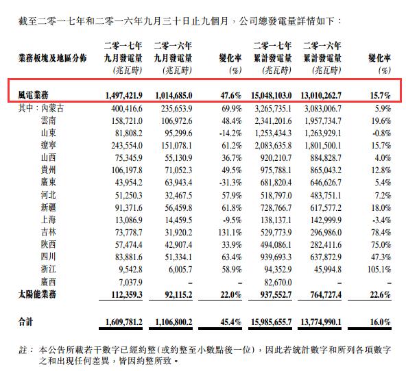 截至2017年9月30日止,華能新能源累計(jì)完成總發(fā)電量159.86億千瓦時(shí)(15,985,655.7兆瓦時(shí)),同比增長(zhǎng)16.0%。其中,風(fēng)電發(fā)電量為1350.48億千瓦時(shí)(15,048,103.0兆瓦時(shí)),同比增長(zhǎng)15.7%。