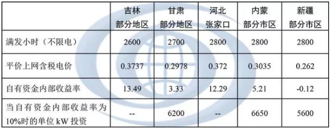 由上表測(cè)算可以看出,2018年電價(jià)調(diào)整后,部分風(fēng)電場(chǎng)已經(jīng)很難滿足自有資金內(nèi)部收益10%的要求,近幾年內(nèi)更無(wú)法滿足平價(jià)上網(wǎng)條件。若要實(shí)現(xiàn)平價(jià)上網(wǎng),以下對(duì)一些投資少、資源好的地區(qū)在不限電情況下進(jìn)行平價(jià)上網(wǎng)分析,包括吉林、甘肅、張家口、內(nèi)蒙、新疆。