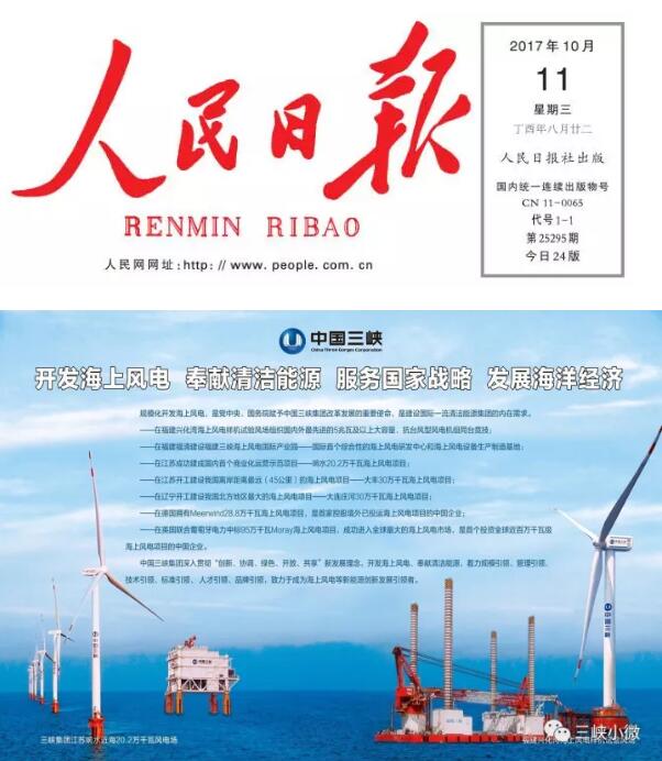 10月11日,《人民日?qǐng)?bào)》用了半個(gè)版面的篇幅宣傳了三峽海上風(fēng)電成就!《 人民日?qǐng)?bào) 》( 2017年10月11日 17 版)開(kāi)發(fā)海上風(fēng)電 ,奉獻(xiàn)清潔能源 ,服務(wù)國(guó)家戰(zhàn)略 ,發(fā)展海洋經(jīng)濟(jì)。規(guī)?;_(kāi)發(fā)海上風(fēng)電,是黨