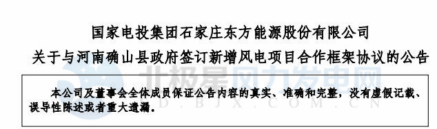 國家電投集團石家莊東方能源股份有限公司公司(簡稱東方能源)與河南省確山縣政府就清潔能源領(lǐng)域戰(zhàn)略合作,簽署了100MW《風(fēng)電項目合作開發(fā)協(xié)議》。該項目規(guī)模 100MW;估算投資金額 8 億。