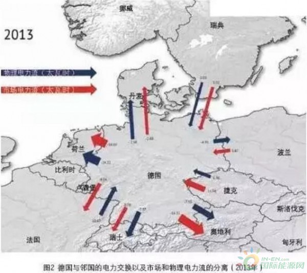 德國(guó)南北區(qū)域間存在著越來(lái)越嚴(yán)重的網(wǎng)絡(luò)阻塞,也存在多種互斥的解決方案。北部具有大量風(fēng)電,以及依靠進(jìn)口煤炭的煤電廠或者廉價(jià)褐煤電廠。相比而言,德國(guó)南部的天然氣、核電(因?yàn)镃O2 價(jià)格過(guò)低)與煤電(需要內(nèi)河運(yùn)輸成本)的成本就顯得高昂了。這種情況下,即使物理上南部并不缺少電力裝機(jī),但是在最小成本調(diào)度、整個(gè)德國(guó)是一個(gè)價(jià)格體系,傳輸容量限制的情況下,負(fù)荷與供應(yīng)地區(qū)不平衡的情況仍舊是存在的。因此,目前對(duì)鄰國(guó),特別是波蘭、捷克等國(guó)網(wǎng)絡(luò)的借用來(lái)實(shí)現(xiàn)電力物理平衡的趨勢(shì)在增強(qiáng)(見(jiàn)圖2)。擴(kuò)大南北電網(wǎng)高壓傳輸容量(電網(wǎng)公司建議的400 千伏、800 千米線路),建設(shè)備用電廠,都可能成本高昂,并遭到了本地居民的強(qiáng)烈反對(duì),短期內(nèi)完全不可能。而將定價(jià)區(qū)進(jìn)一步分割成為其他的備選方案。