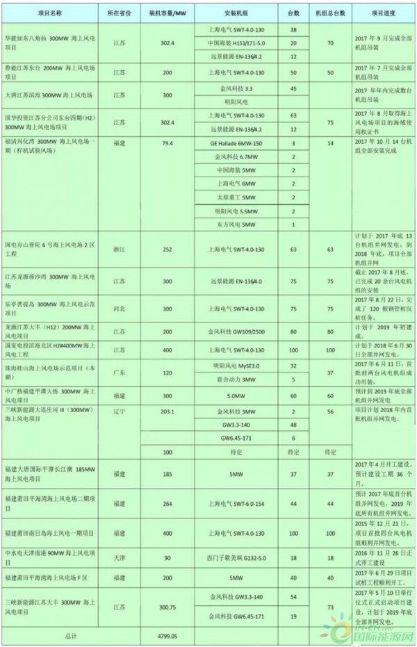 截止2017年8月31日全國在建海上風(fēng)電項(xiàng)目一覽表
