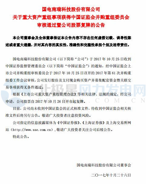 國電南瑞于10 月25 日收到中國證券監(jiān)督管理委員會的通知,其發(fā)行股份及支付現(xiàn)金購買資產(chǎn)并募集配套資金暨關(guān)聯(lián)交易事項獲得無條件通過。經(jīng)公司申請,國電南瑞股票自 2017 年 10 月 26 日開市起復(fù)牌。目前,國電南瑞尚未收到中國證監(jiān)會的正式核準文件。
