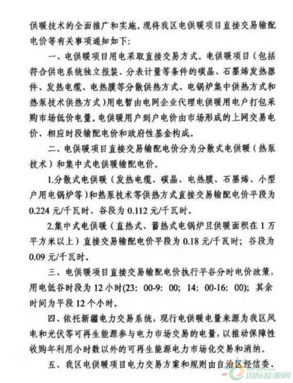 新疆電供暖(風(fēng)電、光伏) 分散式谷段0.112元/千瓦時;集中式谷段0.09元/千瓦時